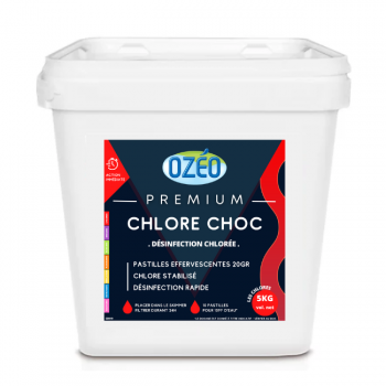 - Hypochlorite de calcium OZEO 5 kg : Chlore à dissolution rapide non stabilisé sous forme de granulés destinés à la désinfection de l'eau de piscine. Agit comme un traitement choc. Comptable avec le traitement au chlore, au brome ou électrolyse au sel.